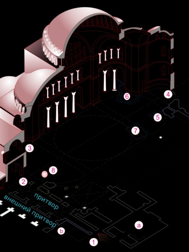 Ещё одним новаторским ходом стало дополнение центрального купола системой из семи полукуполов. Данный приём позволил органично объединить форму базилики с массивным куполом, создав целостное и невероятно просторное внутреннее помещение. Зодчие добились идеального распределения нагрузки: основной свод опирается на полукупола, а те, в свою очередь, передают тяжесть на более мелкие конструктивные элементы. Благодаря этому отпала необходимость в возведении дополнительных колонн для поддержки перекрытия, и главный купол стал производить впечатление невесомого, парящего в вышине. Реализация столь смелой концепции потребовала от создателей проведения невероятно сложных математических расчётов.