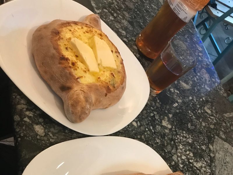 - хачапури по-аджарски (лодочка из теста с сулугуни, топлёным маслом и яйцом сверху — 250–300 руб., ломайте край, макайте в желток, хруст и тянучесть);