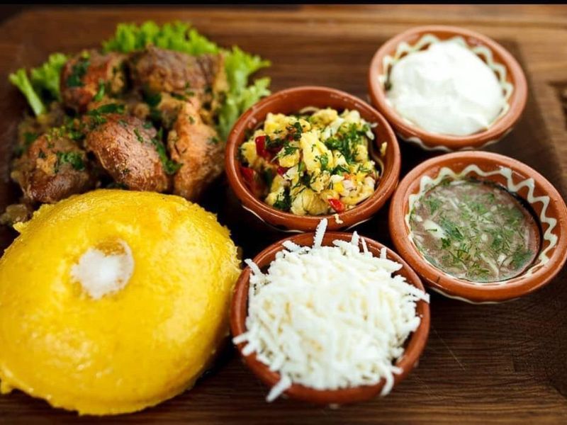 - мамалыга с сулугуни (кукурузная каша с сыром, как полента, но сытнее — 200 руб.);