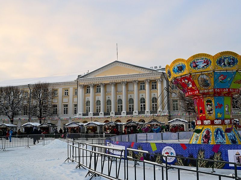 Советская площадь — это сердце новогоднего Ярославля, где с 20 декабря по 9 января расцветает грандиозная ярмарка: лавки с медовухой, пирожками с вишней, handmade-игрушками из дерева и глины, а в воздухе витает аромат хвои и пряников.