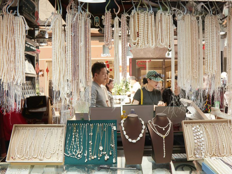 - Сувениры — начинайте с жемчуга (торг от 200 юаней за нить).