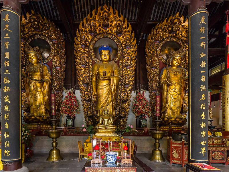 Храм Лунхуа — древнейший буддийский комплекс Шанхая, основанный в 242 году при династии Троецарствия, с семиярусной пагодой 977 года высотой 40 метров и более 5000 статуями в залах стиля Сун.