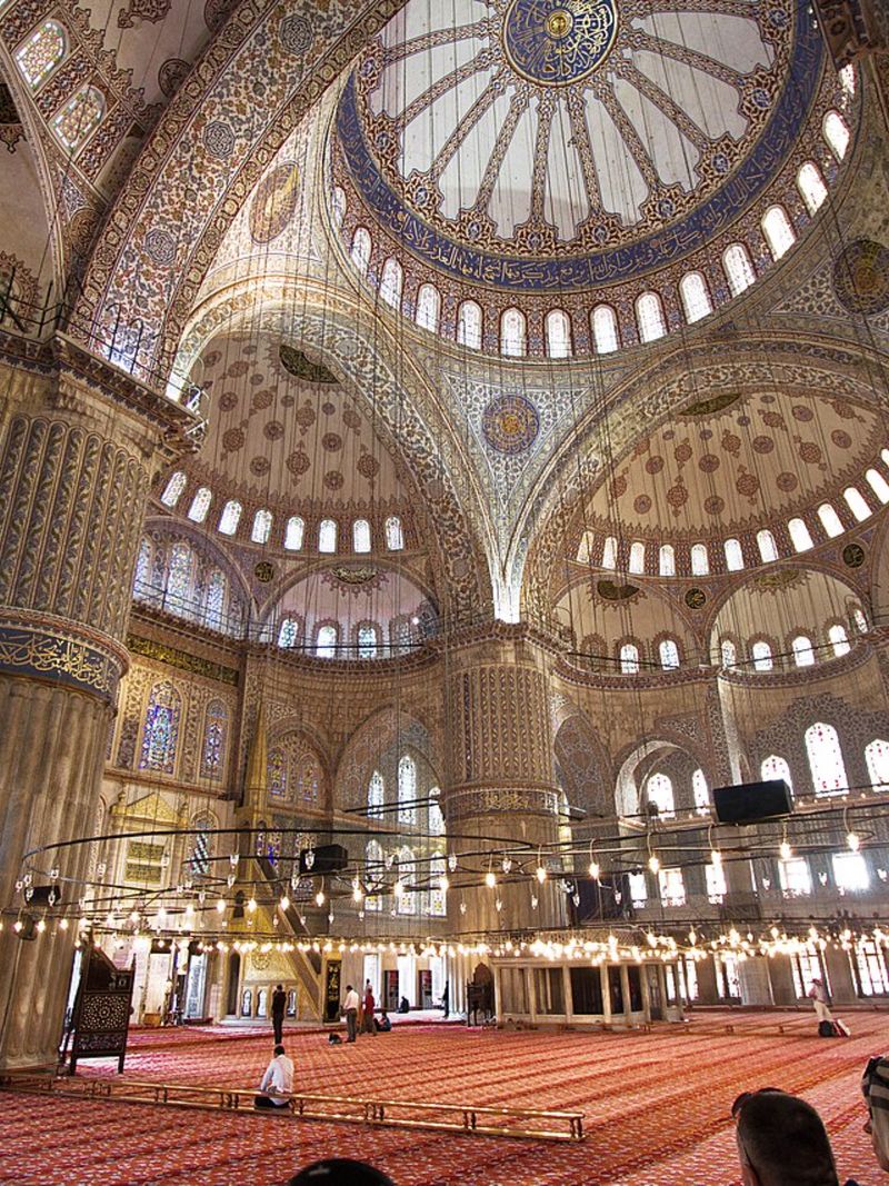 Войдя внутрь, вы попадёте в пространство, залитое естественным светом, который проникает через два с половиной сотни окон. Основное впечатление создаёт внутреннее убранство: стены мечети декорированы тысячами керамических изразцов из города Изник, расписанных изящными синими и белыми орнаментами. В центре зала взгляд неизменно притягивает массивная люстра с десятками ламп, отбрасывающая блики на яркие ковры ручной работы с замысловатыми узорами.
