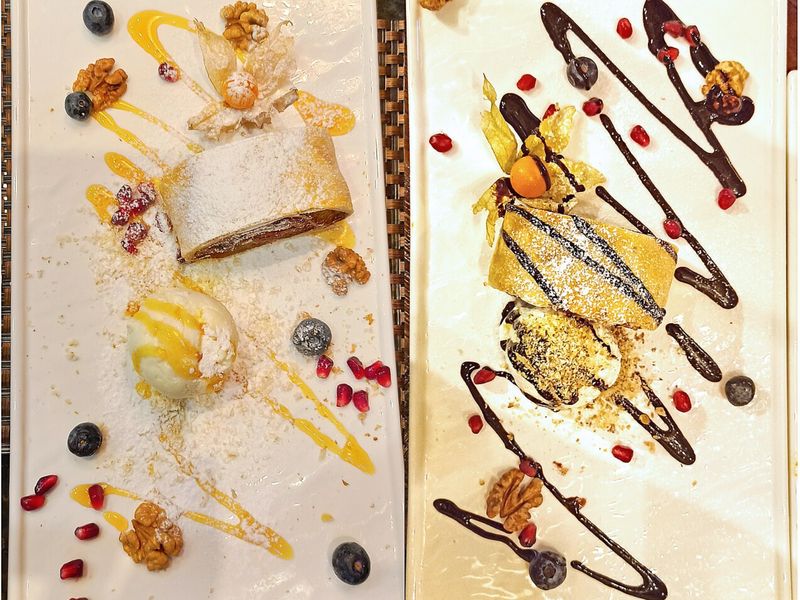 - Десерты: янтарный пудинг (с мёдом и орехами, тёплый); штрудель с яблоками и янтарным мёдом (с корочкой), самый известный марципан.