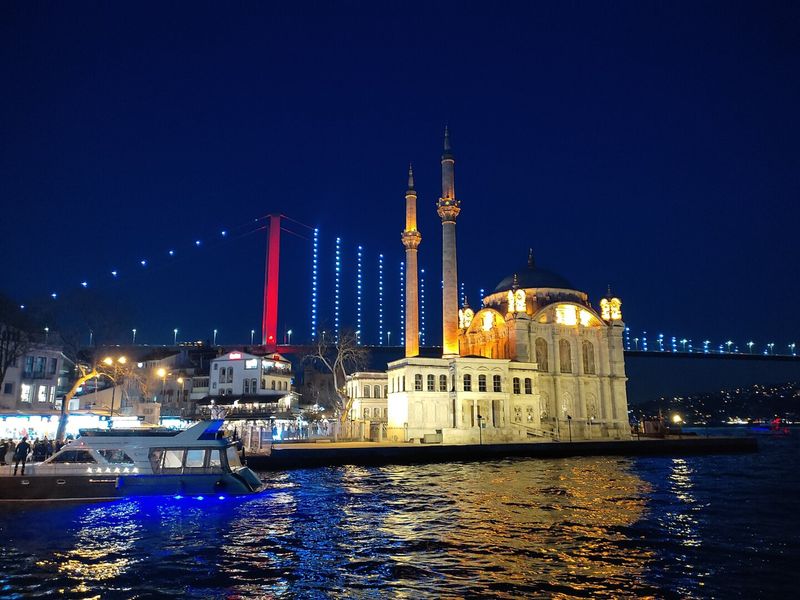 Ортакёй — это маленькая жемчужина прямо под мостом Мучеников 15 июля, где неоклассическая мечеть Ортакёй (1854 года) стоит буквально на воде, а за ней подсвечиваются старинные деревянные ялы XIX века.