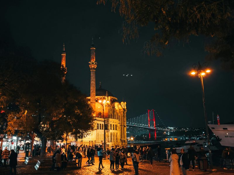 - 20:00 — Ортакёй: занимайте место у мечети или на набережной, где вид на мост идеальный, и закажите кумру с суджуком — традиционную булочку с сосиской, чтобы согреться.
