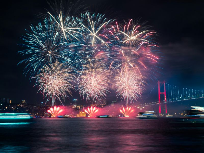 31 декабря в 00:00 Стамбул выдаёт одно из самых зрелищных шоу на планете — лазер и салют над Босфором, который запускают одновременно с нескольких барж посреди пролива и с обоих берегов Европы и Азии.