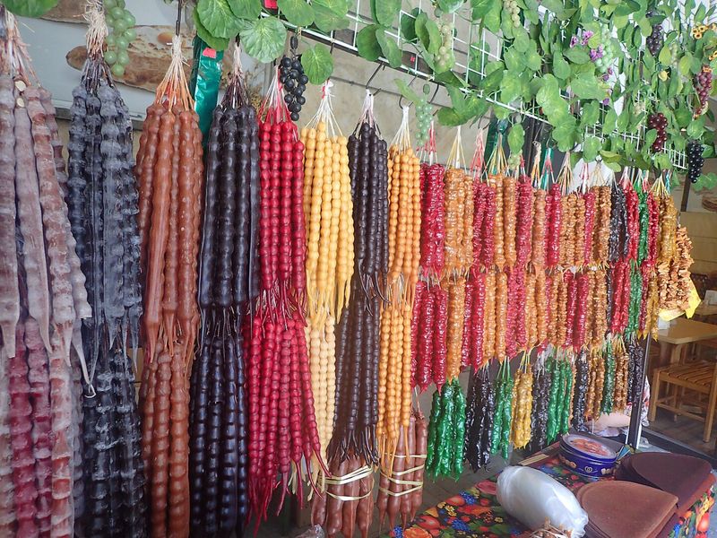 Начните утро с гастрономического рая: чурчхела, висящая гроздьями как виноградные кисти, обещает сладкий год, мандариновые корзины — плетёные из лозы и набитые сочными плодами — шепчут о крымских садах, а мёд с Ай-Петри, золотистый и ароматный, разливают в мини-баночки с этикетками ручной росписи.