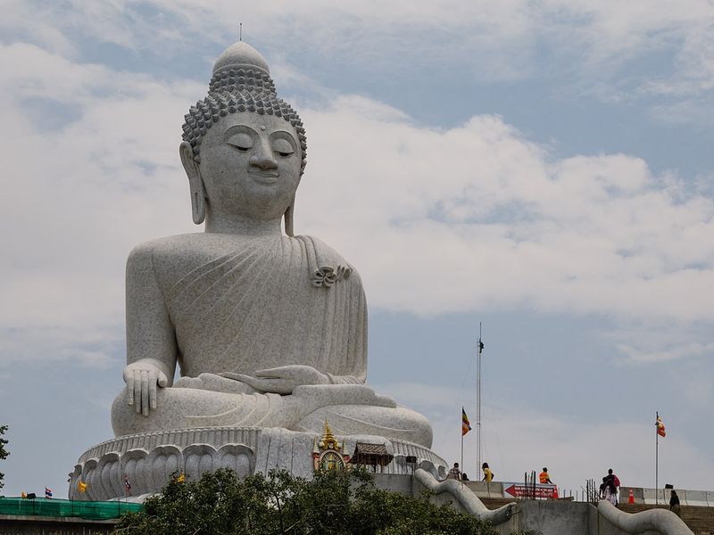 Гигантская белоснежная фигура, возвышающаяся на холме Наккерд, видна из многих точек южного Пхукета. Её масштабы впечатляют: высота — 45 метров, а ширина — около 25. Монумент, ставший визитной карточкой острова, возведён из железобетона и облицован сверкающим на солнце мрамором из Мьянмы. Работы начались в 2002 году, и хотя проект ещё не завершён, статуя уже успела завоевать статус самой посещаемой.