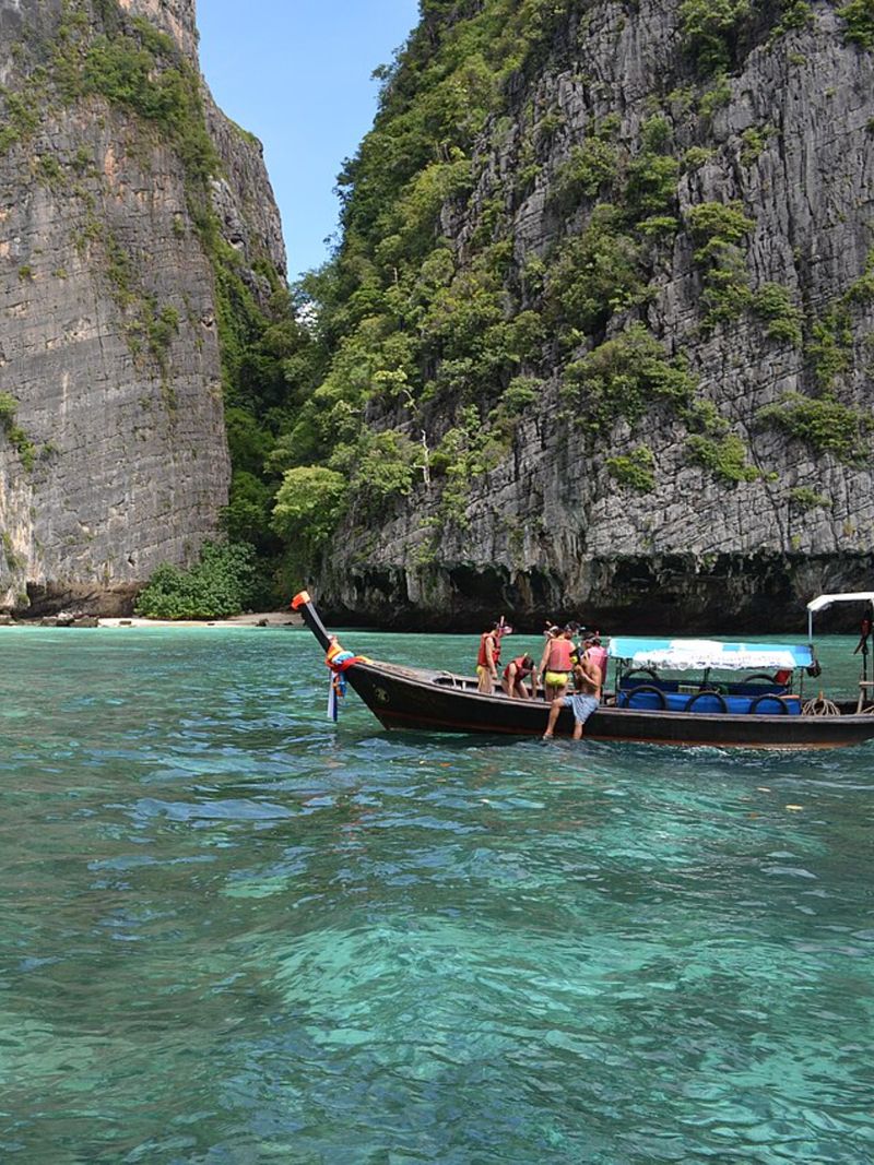 Прославленная кинолентой «Пляж» бухта на острове Пхи-Пхи Ле оправдывает все ожидания: кристальная вода, идеальный песок и величественные скалы. Здесь можно заняться снорклингом, дайвингом или просто провести несколько часов в кемпинге. Самостоятельно попасть сюда невозможно — только в составе экскурсионной группы из Пхукета или Краби.