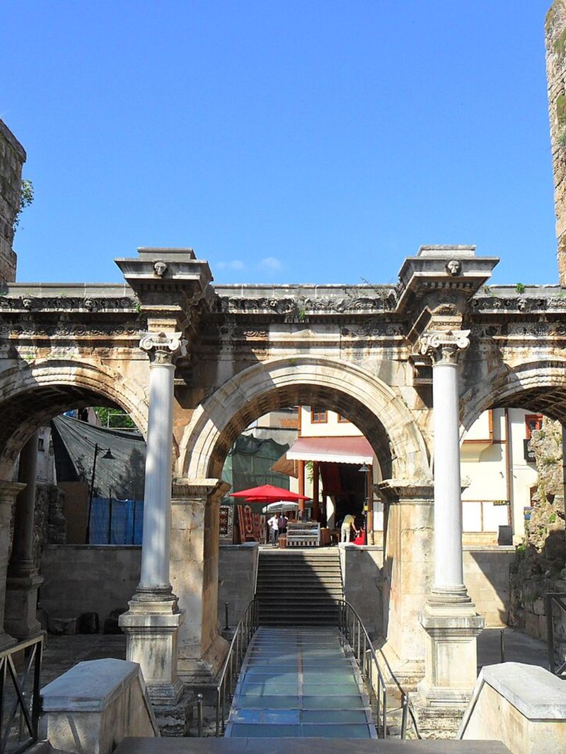 Прогулку по солнечной Анталье логично начать с её знаковой достопримечательности — триумфальных ворот Адриана. Эта тройная арка, декорированная мраморными колоннами с резными капителями, представляет собой впечатляющий памятник античной архитектуры.