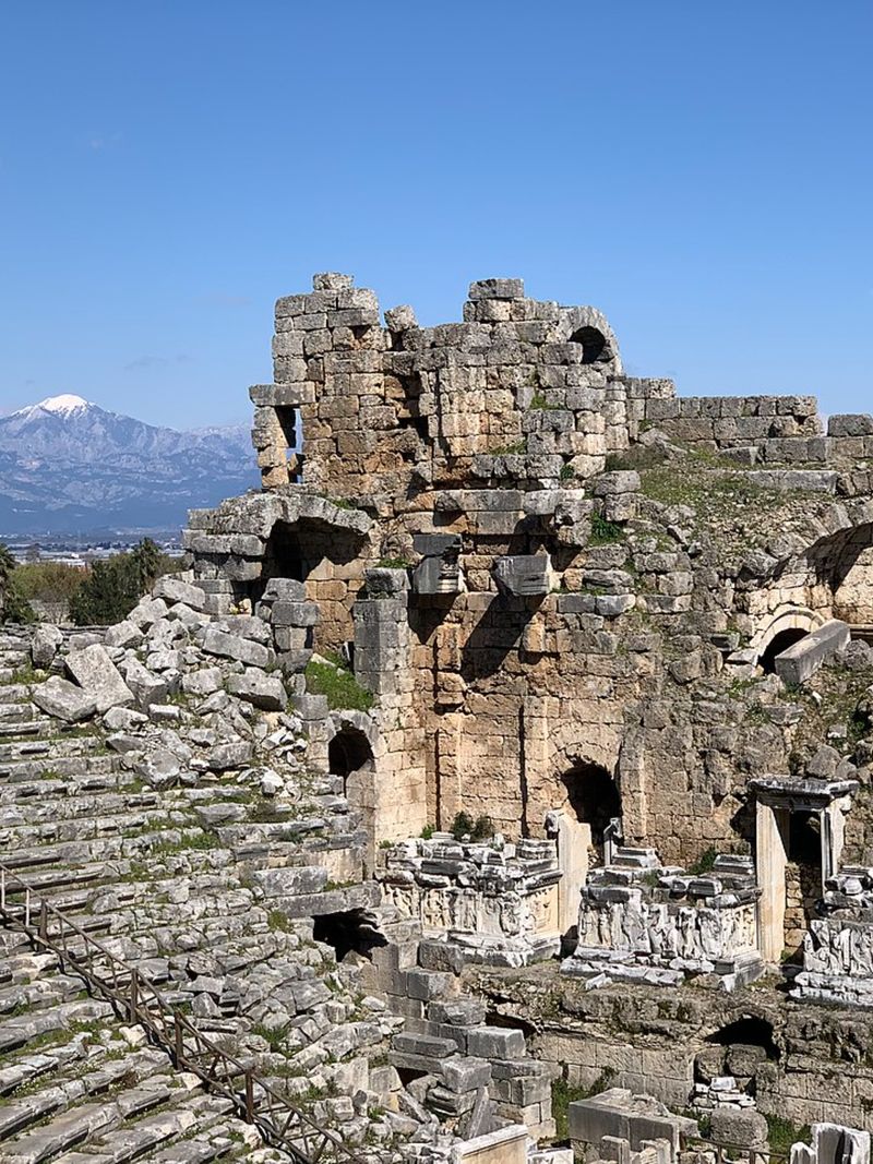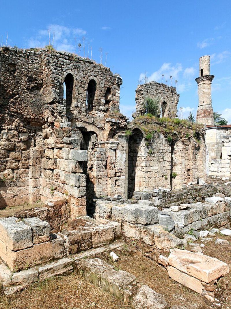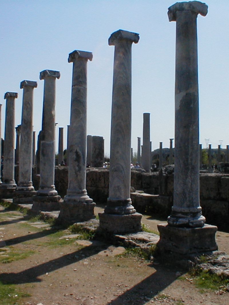 В прошлом он являлся главным городом региона Памфилия, через него пролегали важные торговые маршруты. Известно, что здесь бывал апостол Павел. Масштабы древнего поселения ощутимы и сегодня: центральная Колонная улица словно уходит за горизонт, превосходно сохранились агора, византийская базилика и стадион.