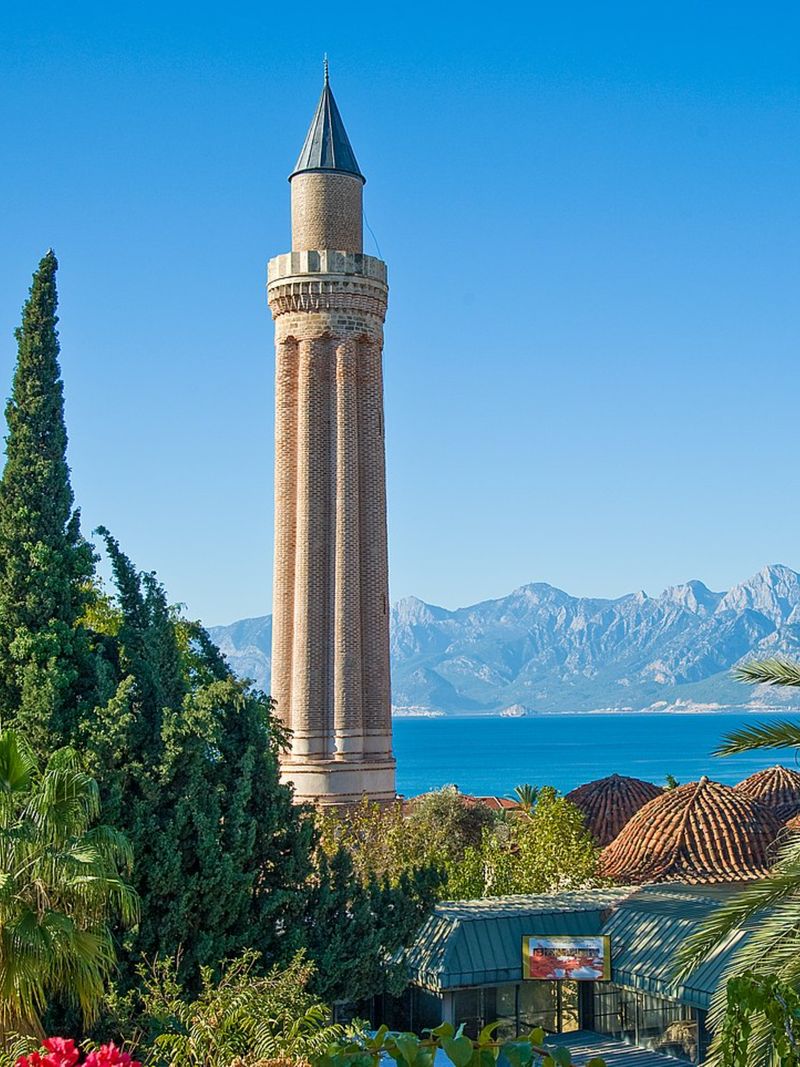 Сказочное по красоте сооружение часто украшает открытки с видами Антальи. Сорокаметровую башню из красного кирпича, возносящуюся над терракотовым морем крыш, прекрасно видно из многих точек города. Её также называют Великой мечетью или именуют Алааддином — в честь султана, повелевшего возвести минарет в тринадцатом веке.