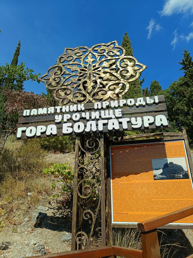 С вершины Болгатуры прекрасно виден главный природный страж Гурзуфа — гора Аю-Даг. Её пятисотметровый силуэт, напоминающий исполинского медведя, склонившегося к воде, породил красивую легенду. Говорят, что вождь медвежьего племени, пытаясь вернуть сбежавшую с юношей воспитанницу, начал пить море, да так и окаменел от горя. Отсюда и название - в переводе с крымско-татарского языка оно звучит как Медведь-гора.