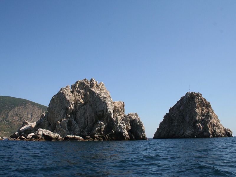 Эти две скалы-близнеца, гордо возвышающиеся из морской глади прямо напротив набережной, кажутся верными стражами Гурзуфа. В народе их ласково кличут «Медвежатами», подчёркивая их близость к главному гиганту — Медведь-горе. Их название вполне логично переводится как «острова».