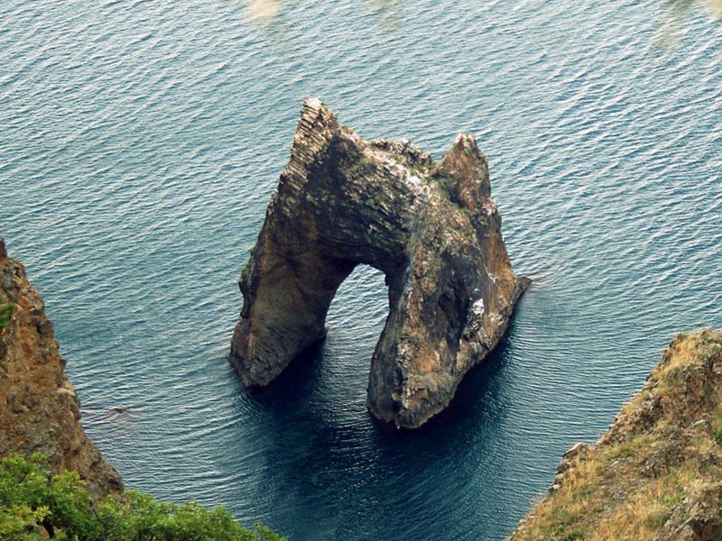 Прямо у подножия Карадага из морских вод поднимается главный природный символ побережья — скала-арка «Золотые ворота». В былые времена её нарекли «Чёртовыми воротами», полагая, что этот проём ведёт прямиком в подземное царство. Сегодня это одна из самых фотогеничных достопримечательностей. Согласно поверью, если на катере проплыть сквозь арку, загадав заветное желание, оно непременно сбудется в грядущем году.