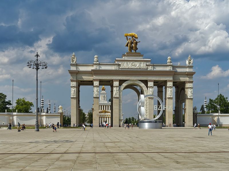 - На ВДНХ: фонтаны, павильон «Рабочий и колхозница».