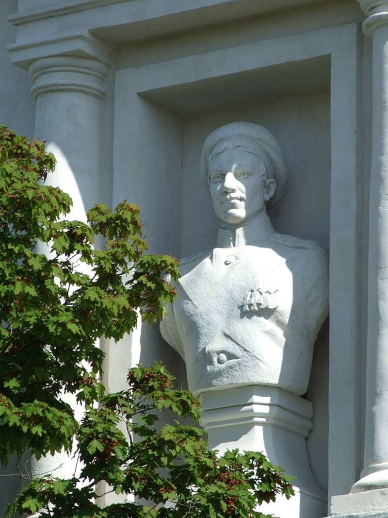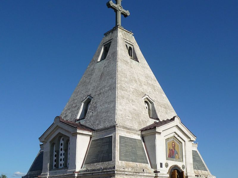 Архитектурный ребус в виде египетской пирамиды, которую венчает исполинский крест. Внутри на стенах разместили тридцать восемь мраморных плит, где золотом вписаны имена офицеров, сложивших головы в первую оборону города.