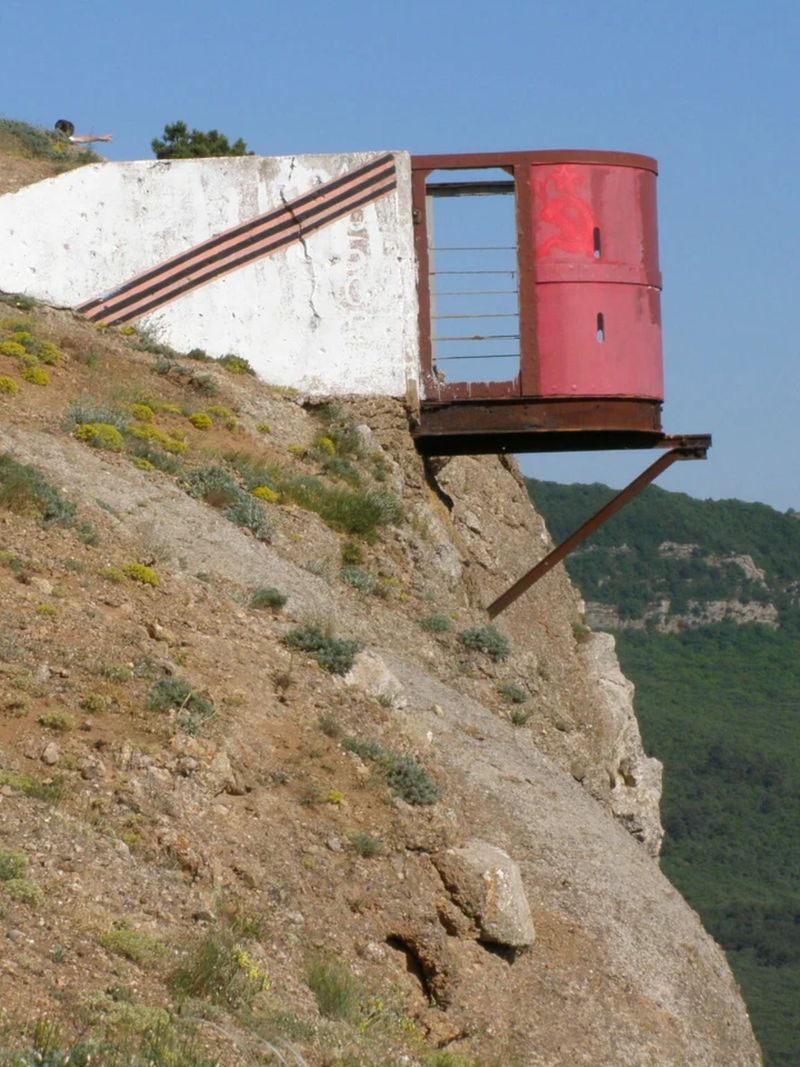 Эта грозная конструкция из листовой брони, примостившаяся на вершине горы Аскети, — часть руин форта «Южный». Среди туристов упорно живёт легенда, будто бы немцы использовали её для расстрелов советских бойцов, сбрасывая тела в пропасть. Этому мрачному сюжету даже посвятил своё полотно севастопольский художник Коваленко.