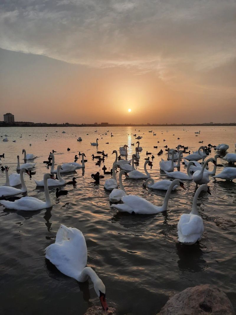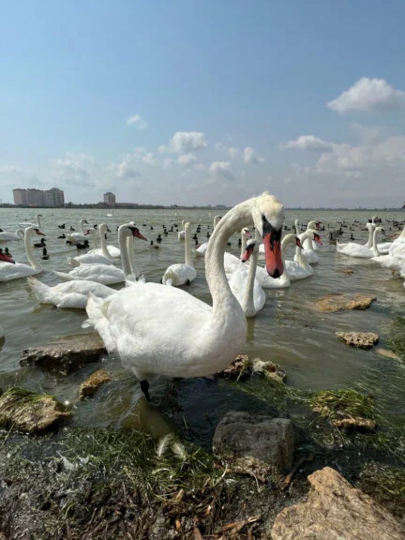 Фактически это западная часть Сасык-Сиваша, отделённая от основного водоёма автомобильной трассой. Его главное отличие — меньшая солёность, что позволило здесь водиться рыбе и, что логично из названия, обосноваться многочисленным лебедям. Эти величественные птицы совершенно не боятся людей и с достоинством принимают угощения, создавая идиллическую картину.