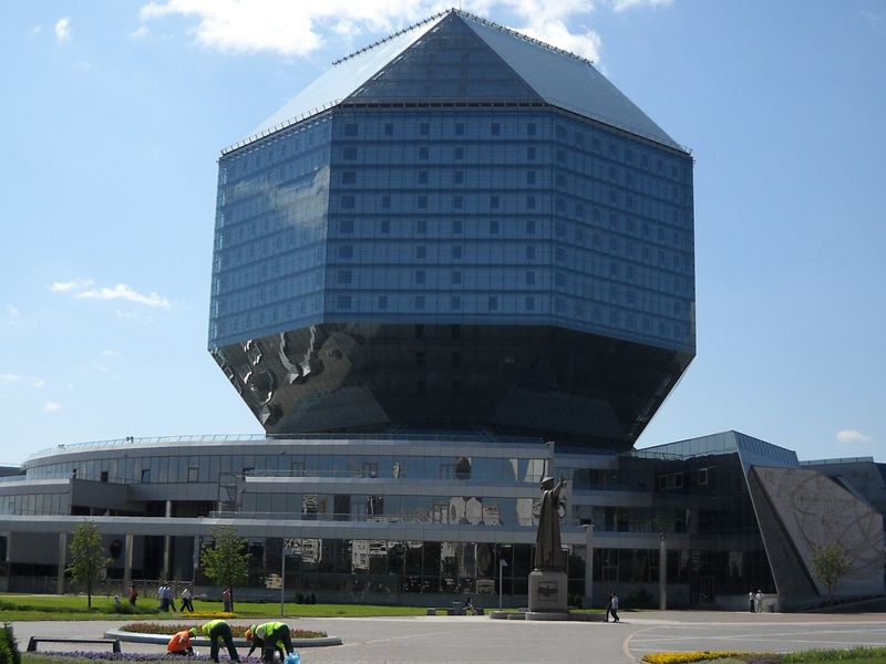 Национальная библиотека — «белорусский алмаз», футуристическое здание 2006 года архитектора Виктора Крамаренко, высота 73 м, форма ромбокубооктаэдра (22 грани, символ знаний). Библиотека — символ возрождения, построена на месте бывшего ипподрома, внутри лифт на 23 этаж за 40 сек.