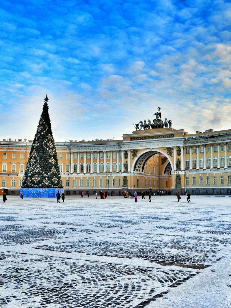 Дворцовая площадь зимой преображается: её монументальный простор подчёркивает искрящийся снег, а знаменитый Зимний дворец и Александровская колонна создают впечатляющий фон для главной новогодней ёлки и праздничного катка.