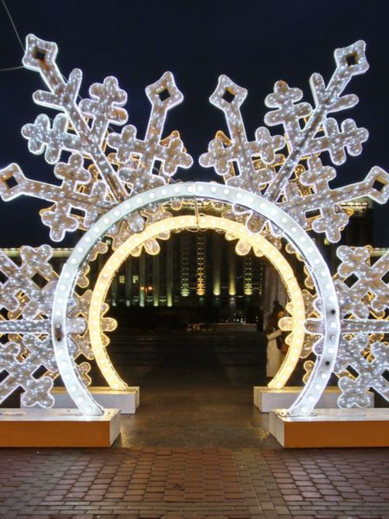С наступлением темноты площадь погружается в море огней, превращаясь в настоящую декорацию для зимней сказки.