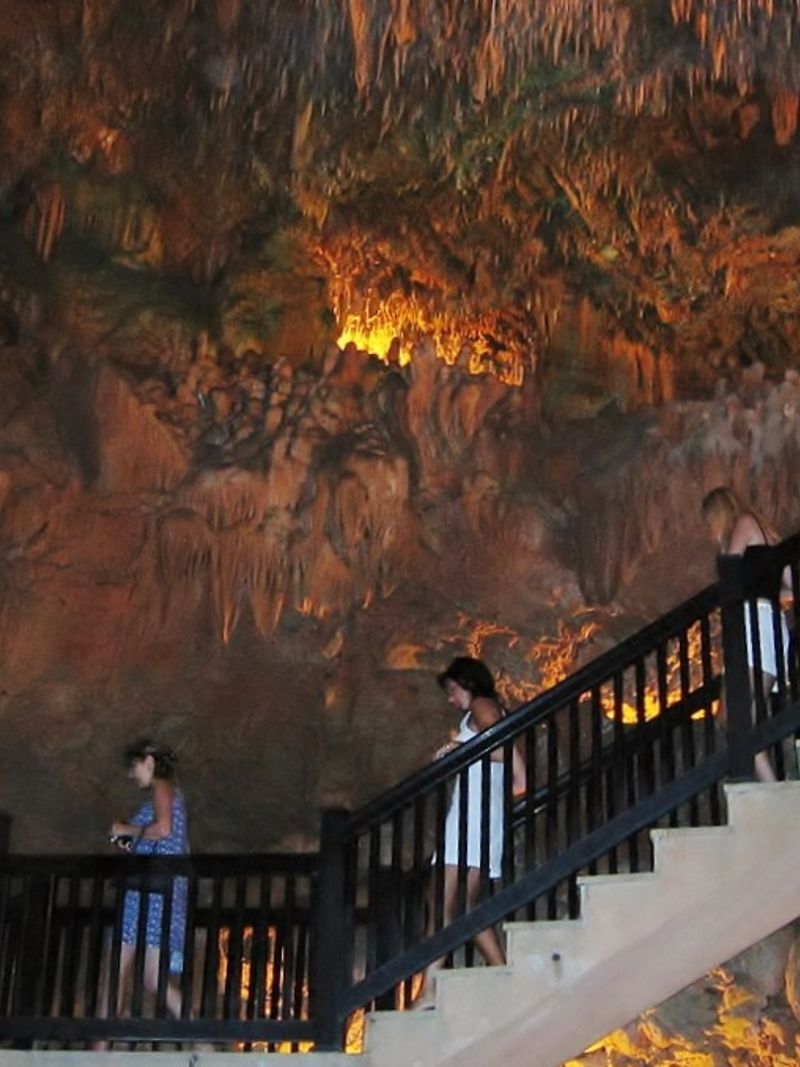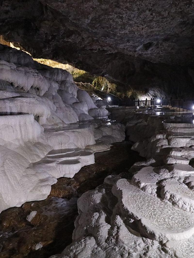 На глубине до 190 метров вас ждёт миниатюрная копия Памуккале: причудливые известковые образования, сталактитовые гирлянды и целебные родники. На знакомство с этим царством сюрреалистической геологии потребуется около получаса.
