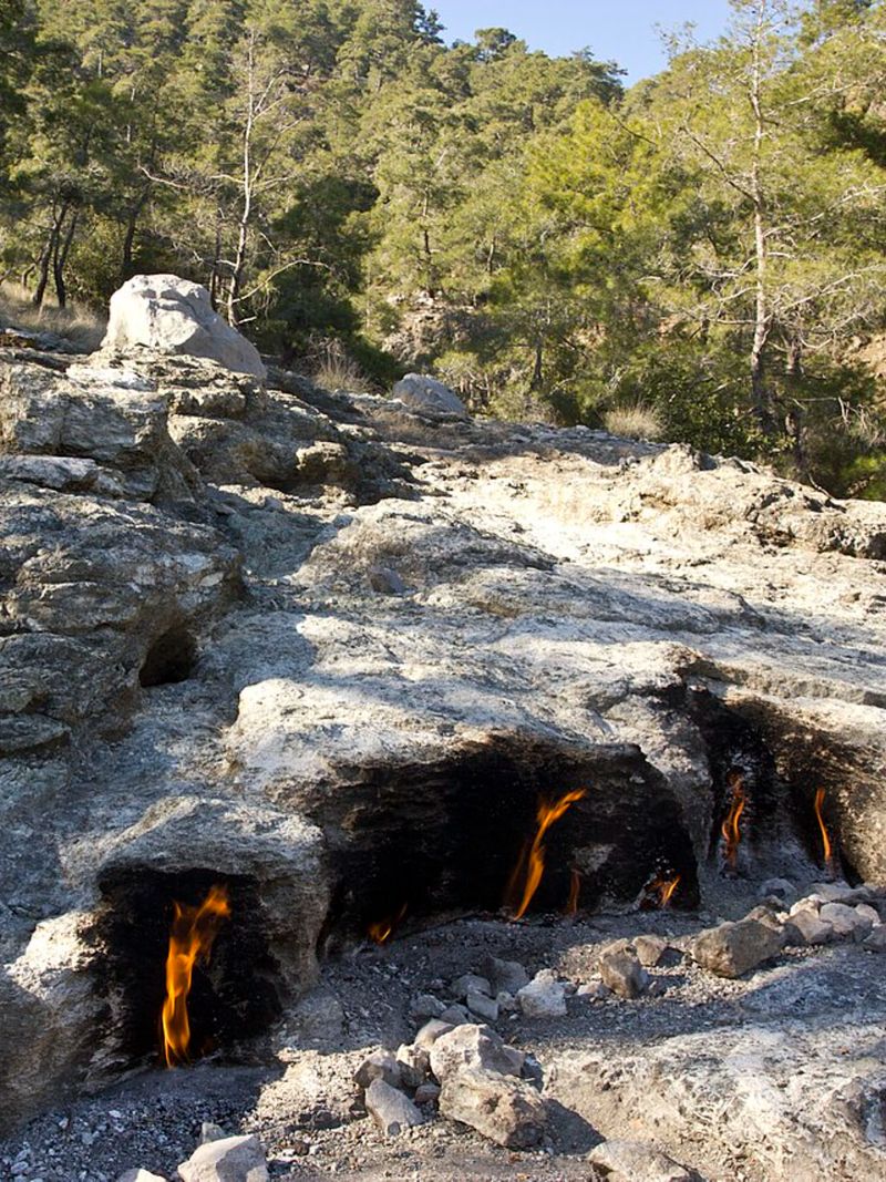 Это место бросает вызов законам природы: вот уже две с половиной тысячи лет склоны горы пронзают языки пламени, рождённые выходами природного газа. Естественно, такой феномен не мог обойтись без эпичной легенды.