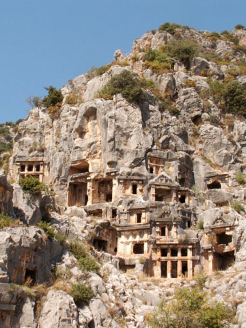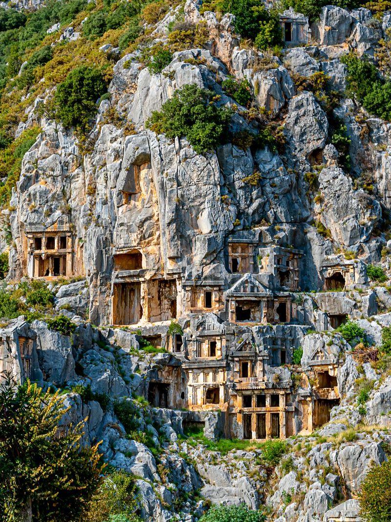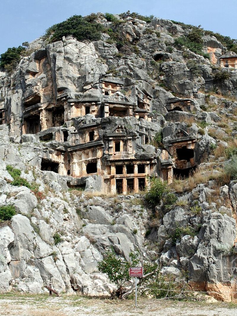 Визитная карточка Миры — ликийские гробницы, высечённые в отвесных скалах. Их фасады, стилизованные под жилые дома, создают впечатление, будто целый город замер на крутом обрыве. Эта архитектурная традиция отражала веру в то, что души усопших легче достигнут небес, если их последнее пристанище будет расположено как можно выше.