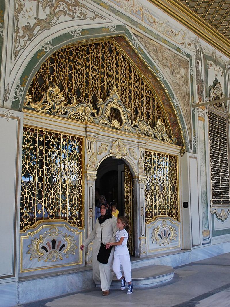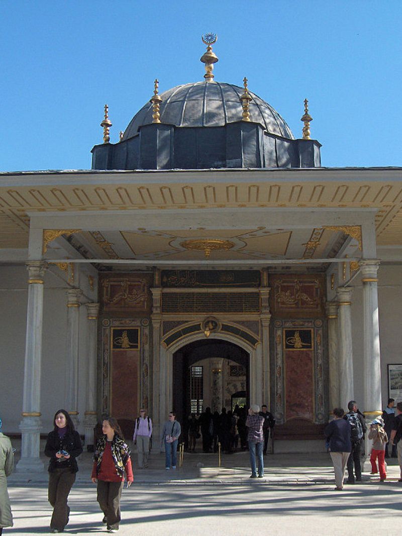 Попасть в зону принятия государственных решений можно было через Ворота Приветствия (Баб-ус-Селям), чей зубчатый силуэт напоминает европейские средневековые замки. Согласно этикету, только султан имел право проезжать здесь верхом; все остальные, включая высших сановников, должны были идти пешком. Рядом с воротами располагалась комната для ожидающих аудиенции — и, для контраста, помещение палача. А прямо под сводами ворот находились камеры для приговорённых к казни.
