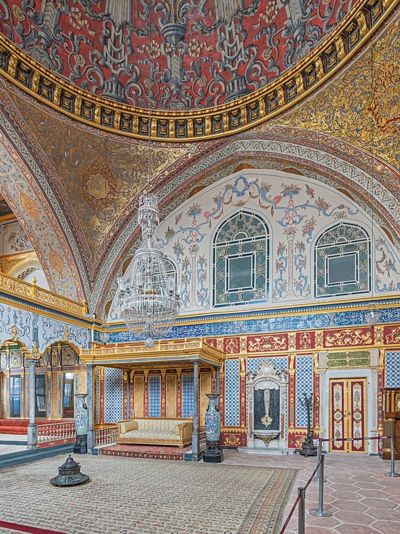Главная резиденция османов раскинулась на впечатляющей территории в 700 тысяч квадратных метров, защищённой крепостной стеной длиной в 1400 метров. По сути, это был автономный город внутри столицы, где одновременно могли проживать до 5 тысяч человек. В его пределах располагались всё необходимое: от гигантских кухонь и императорских конюшен до оружейных складов и роскошных садов с фонтанами. Правда, этот облик складывался постепенно. Вплоть до середины XIX века Топкапы постоянно достраивали и обогащали новыми деталями, что и породило его эклектичную архитектуру — причудливое переплетение османских традиций, барокко и ампира.