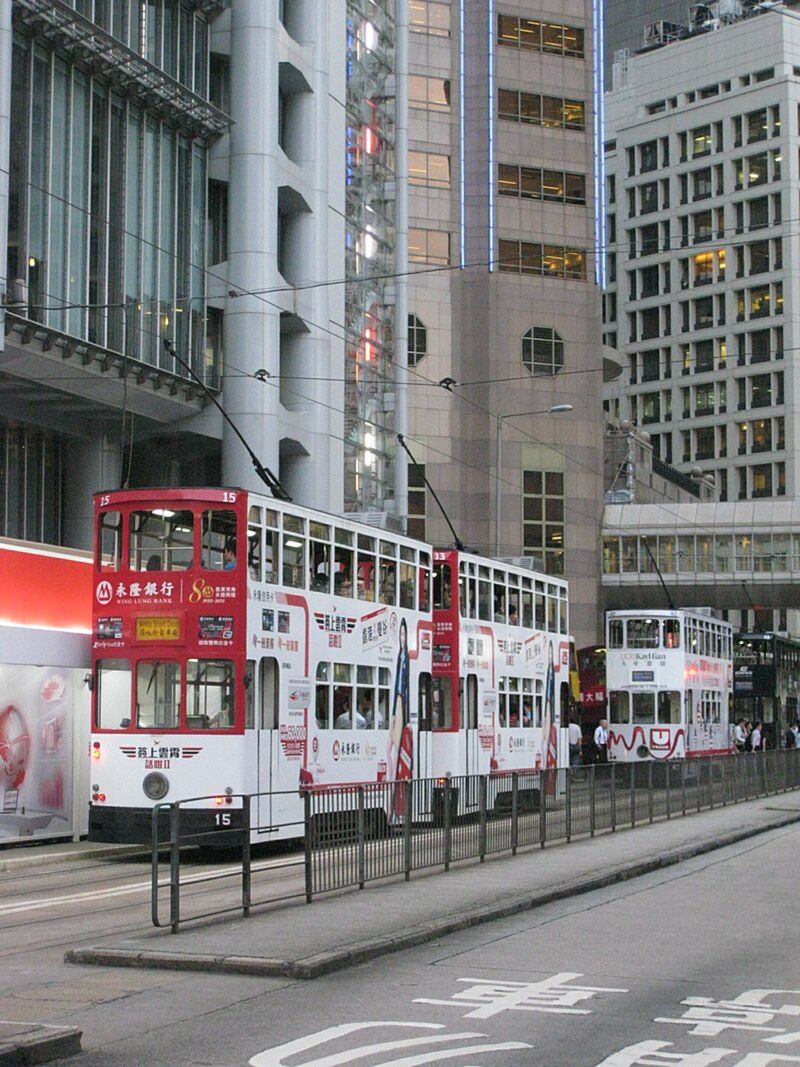 Знаменитые трамваи «Ding Ding». Эти двухэтажные ретро-вагончики курсируют только по острову Гонконг. Проезд здесь фиксированный, а платят за него при выходе, через переднюю дверь.