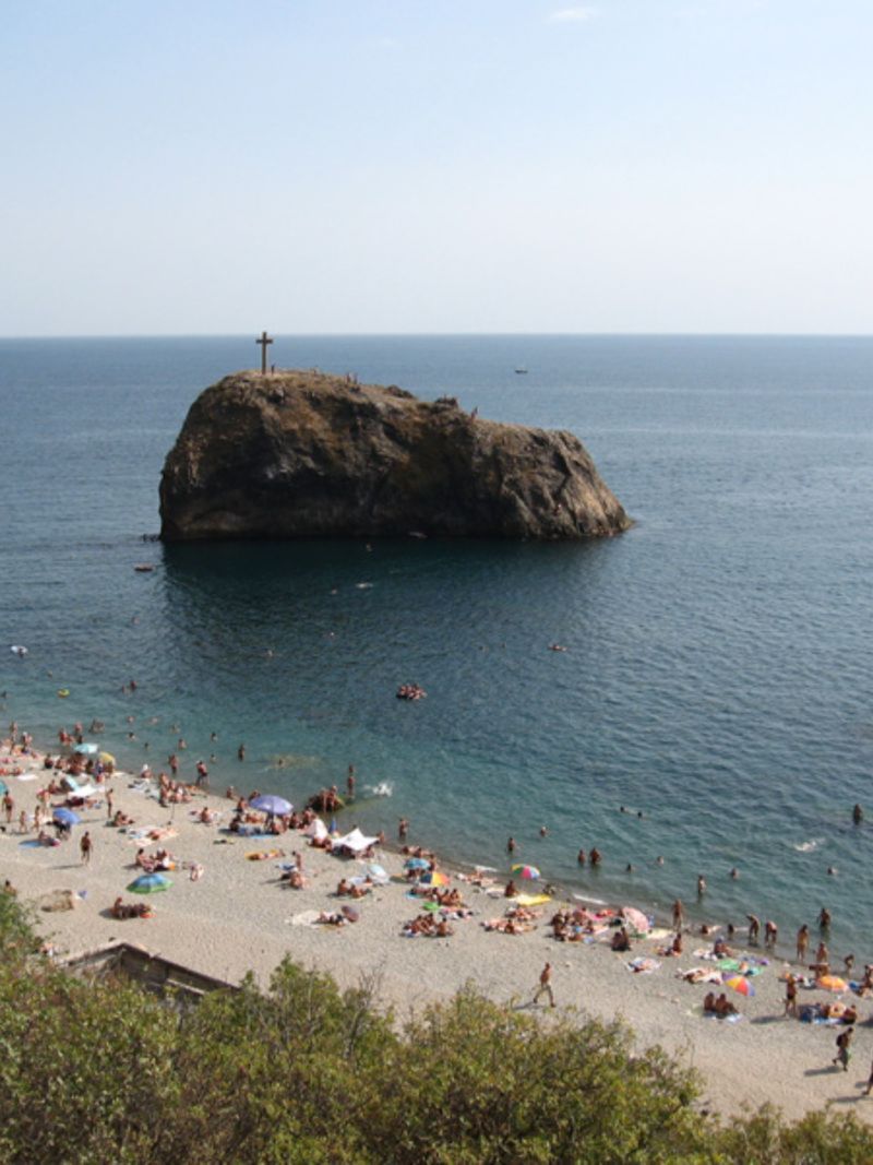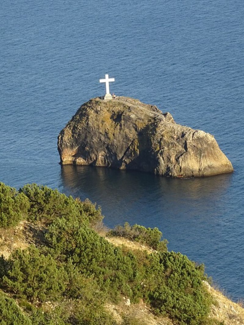 Георгиевская скала. Именно к этой скале, если верить легенде, волны принесли тех самых моряков. В память о чудесном спасении на ней установлен величественный крест, ставший символом мыса.