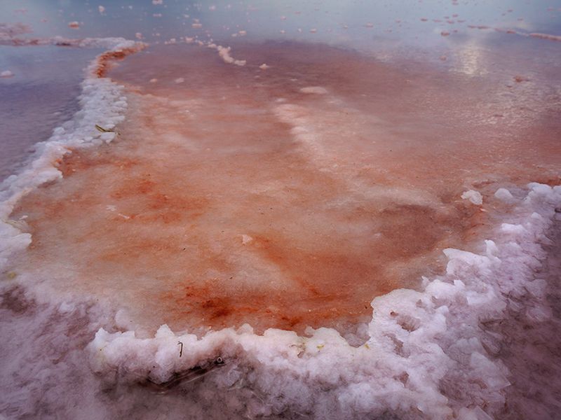 - Зимой озеро затягивается коркой соли и льда — зрелище суровое, но необычное.