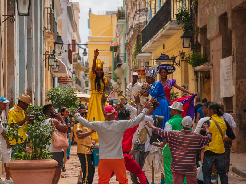 Толпы от Habana Vieja к Centro Habana танцуют в вихре: юбки кружатся, барабаны бьют в кровь, фейерверки вспыхивают над колониальными фасадами, окрашивая барокко в цвета карнавала.