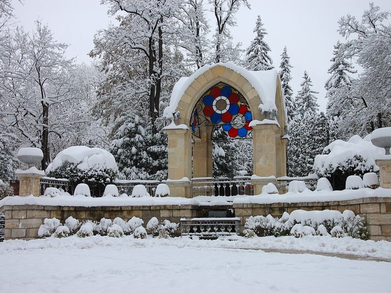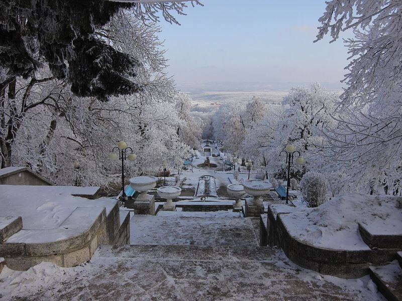 Парк создан в 1823 году по указу Александра I, а в XIX веке здесь гуляли Пушкин и Лермонтов. Зимой он особенно красив: замерзшие водопады, снежные скульптуры и виды на Эльбрус (если повезет с погодой).