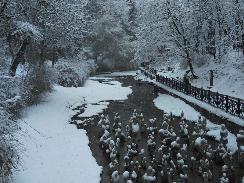 Снежные тропы ведут к Лермонтовской скале, сияющей как из романа «Герой нашего времени», нарзанные источники в гирляндах парят теплым паром, а дети визжат от радости, катаясь на санках у каскадной лестницы.
