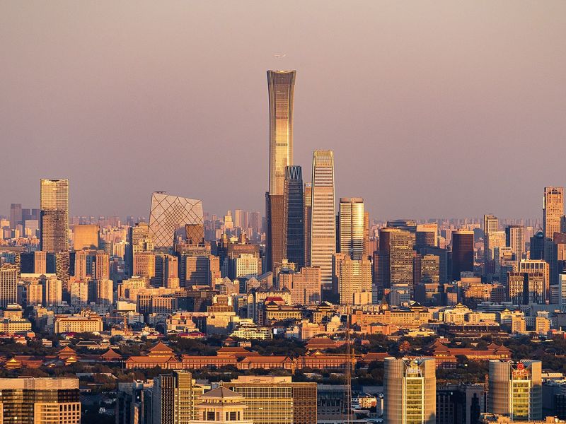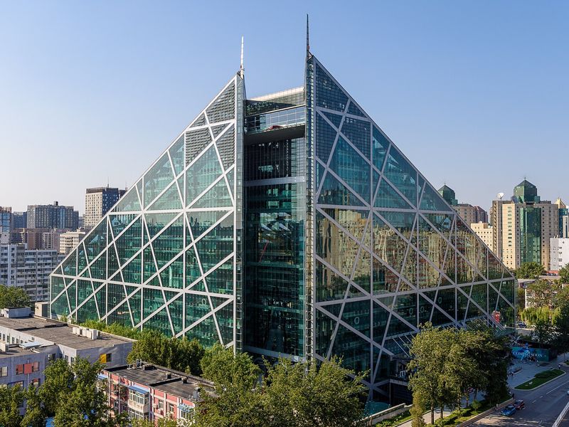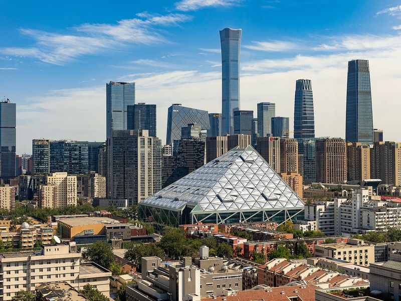 Современные кварталы CBD в Пекине — стеклянные башни Z15 (528 м) и торговые центры. Район вырос в 1990-х на месте ферм, легенда: император Цинь Шихуанди предвидел здесь центр силы.
