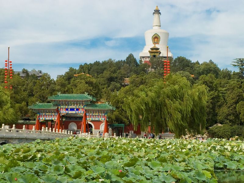 Парк Бэйхай — с белой пагодой, построенной по велению Кублай-хана; легенда о бессмертных, плавающих на лодках. В 2025-м AR оживит легенды: увидите слёзы Мэн на стене.