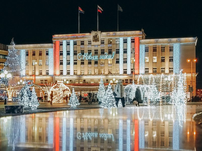 Площадь Победы — это классика калининградского праздника, где главная ёлка высотой 30 метров сияет с 25 декабря, а 31 декабря с 22:00 начинается народное гуляние с главной сценой у фонтана.