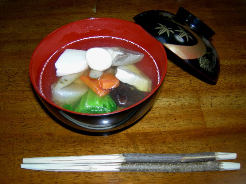 Главное блюдо — дзони: прозрачный суп с кусочками моти (рисовые лепёшки, которые делают всей семьёй, колотя рис в огромных ступах). В каждом регионе дзони разный: в Токио — с курицей и шпинатом, в Кансае — белый мисо и круглые мочи, в Осаке добавляют таро.