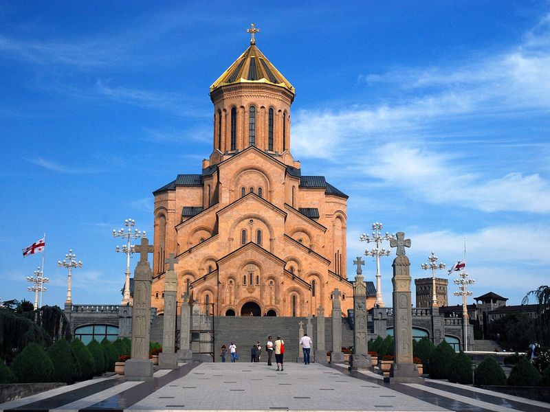 Собор Святой Троицы (Самеба, 2004 г.) — крупнейший храм Грузии, высотой 97 метров, с золотыми куполами, которые осенью отражаются в листве. Построенный как символ возрождения после СССР, собор украшен мозаиками и фресками, изображающими сцены из Библии и грузинской истории.