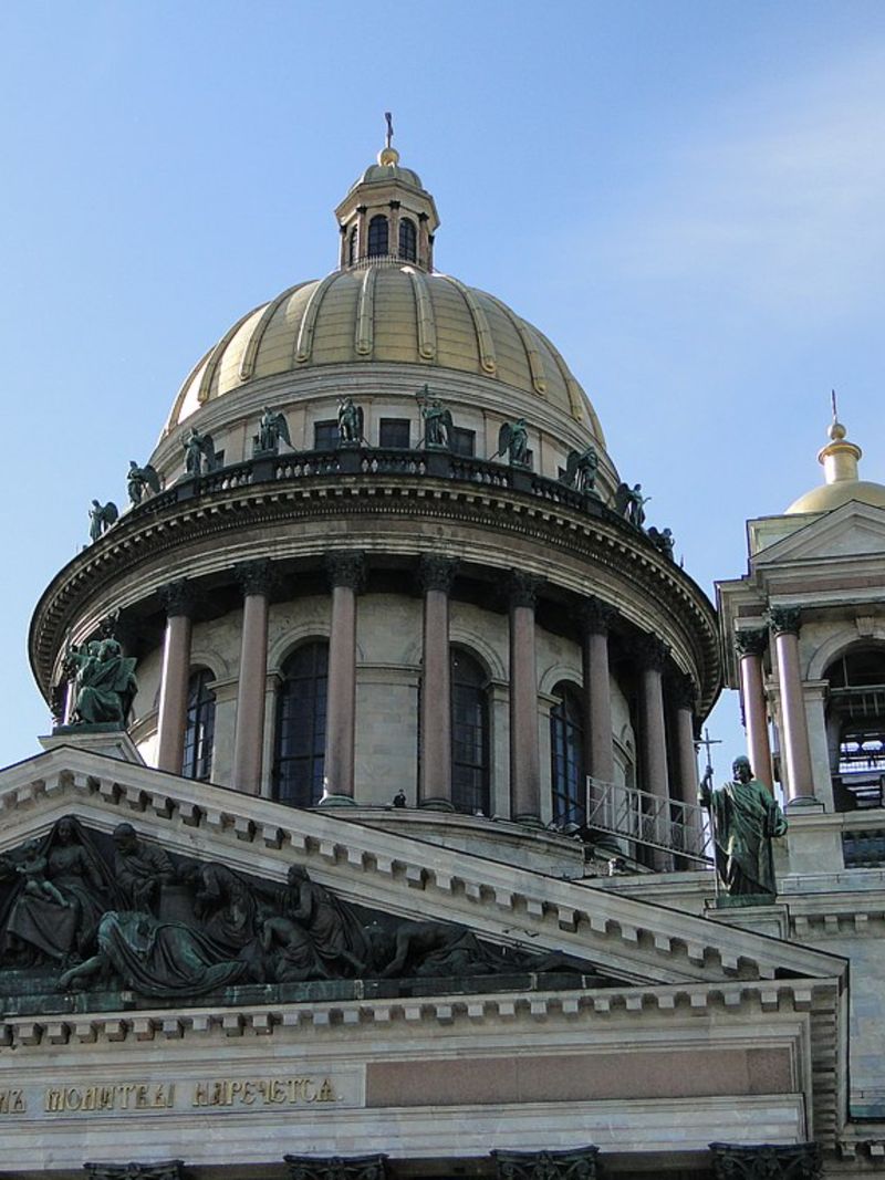 Венчающая Исаакиевский собор скульптурная композиция представляет собой уникальный ансамбль религиозного искусства. На высоте 101,5 метров размещены: