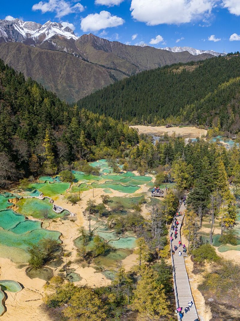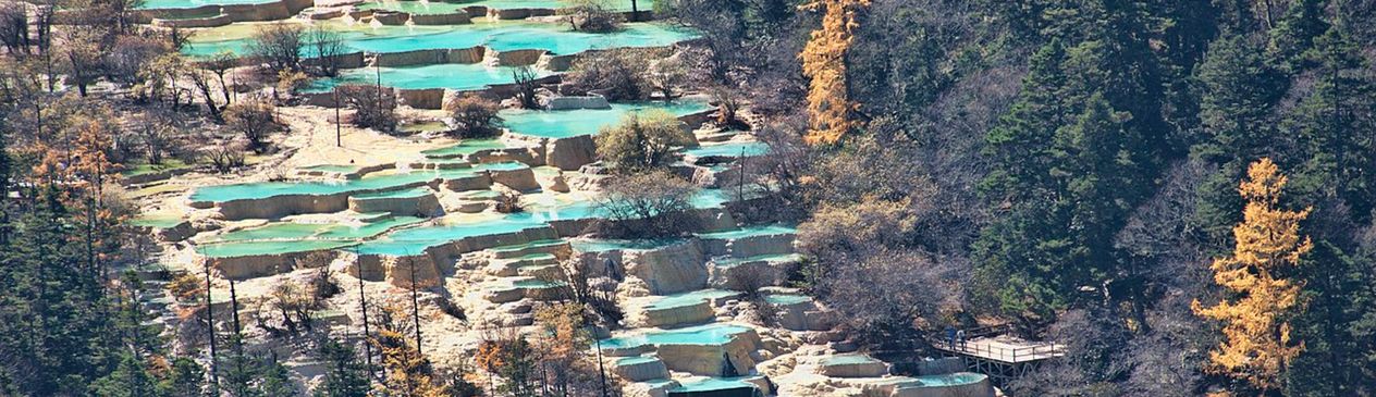Представьте, что какой-то великан решил выложить склон горы гигантской мозаикой из бирюзы, янтаря и малахита. Именно так выглядит долина Хуанлун — одно из самых щедрых на краски мест в Китае. На северо-западе провинции Сычуань расположился национальный парк, где природа вовсю экспериментировала с палитрой. Более трёх тысяч разноцветных озёр, перетекающих друг в друга, образуют громадный каскад протяжённостью почти три с половиной километра.