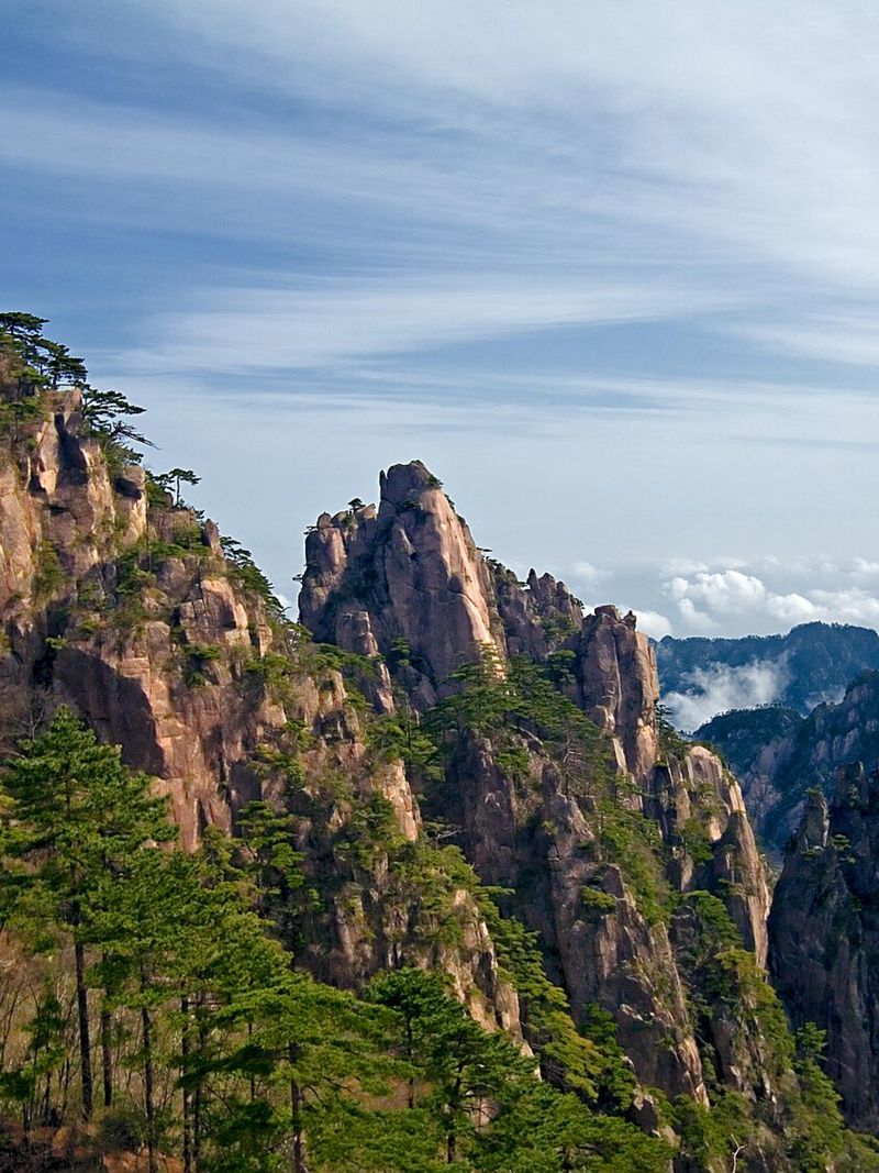 Но главной диковинкой этих мест стали даже не пики, а деревья. Склоны от отметки в восемьсот метров и до самых небес украшают вековые сосны, каждая из которых обладает своим характером и формой. Одни выглядывают из-за скал с детским любопытством, другие застыли в почтительном поклоне, третьи раскинули ветви, словно в глубоком сне. Местные жители, впечатлённые их выразительностью, дали им поэтичные имена: «Шахматная доска», «Спящий дракон» или «Сосна, встречающая гостей». Последняя, кстати, получила своё название за ветви, которые тянутся в сторону тропы, будто приветствуя каждого путника.