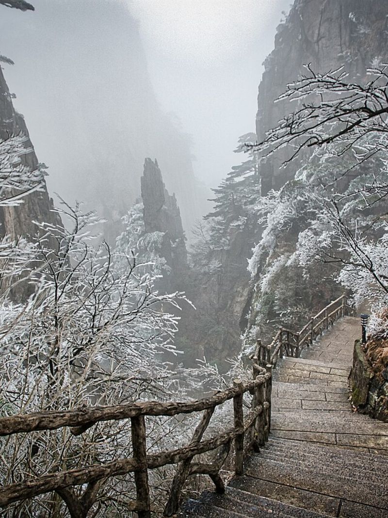 На востоке Китая, в провинции Аньхой, расположен национальный парк, который смело можно назвать эталоном китайского пейзажа. Здесь возвышается одноимённый горный массив, венчаемый семью десятками вершин. Среди них выделяются три знаменитости: пик Лотоса, пик Небесной Столицы и Блестящий пик. Первый, взметнувшийся на 1873 метра, — местный небоскрёб, остальные лишь ненамного ему уступают. Добраться до вершин можно двумя путями: лениво подняться на фуникулёре или проявить доблесть и одолеть горные тропы за три-четыре часа неспешного подъёма.