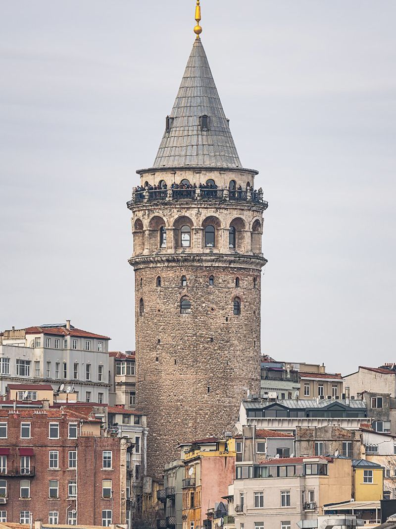 Архитектурной доминантой района является 60-метровая Галатская башня, возведённая в XIV веке как часть оборонительных сооружений. Всемирную известность она приобрела благодаря смелому эксперименту османского изобретателя Хезарфена Ахмета Челеби, который в начале XVII века совершил с её вершины полёт через Босфор на самодельных крыльях.