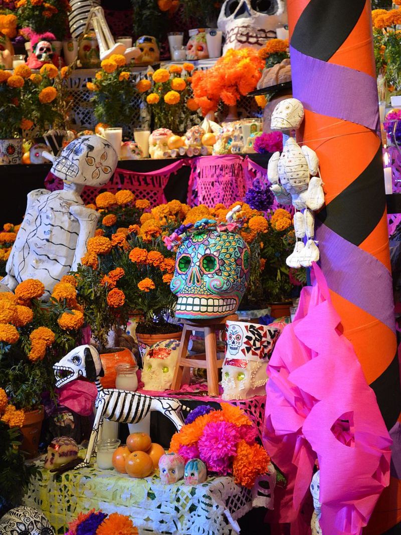 Согласно поверьям, в эти ноябрьские дни души усопших получают пропуск в мир живых. Первыми навещают родных души детей, а следом за ними являются взрослые. Чтобы почтить их визит, мексиканцы возводят в домах и на улицах пёстрые алтари-офренды. Их украшают огненно-оранжевые бархатцы, ароматный ладан, соль, любимые кушанья и напитки предков, а также обязательные сахарные черепа. Каждая деталь исполнена смысла: свечи и благовония служат путеводными маяками для заблудших душ, цветы манят их своим ароматом, а сладкие черепа, сделанные из марципана или шоколада, призваны… подсластить горькую пилюлю факта конечности бытия. Алтари выстраивают в несколько ярусов; классический двухъярусный вариант олицетворяет небесный и земной миры.
