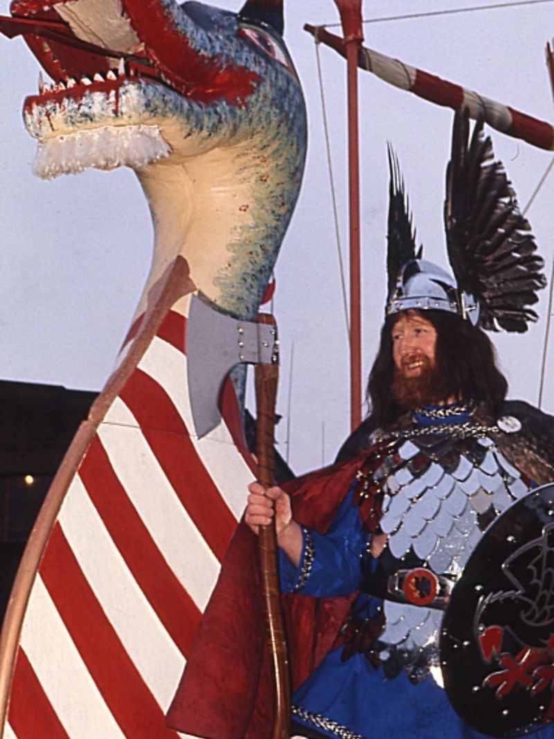 Во главе шествия гордо шагает отряд ярла Гизера — короля викингов, которого специальный комитет выбирает каждый год заново. Эта свита из нескольких сотен человек торжественно проносит к воде драккар — точную копию древнего боевого корабля.